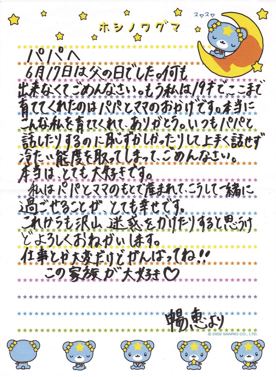 日曜日は父の日だったんですね。昨日、上の娘が家族全員の軌跡を写真にまとめ、手紙をくれました。