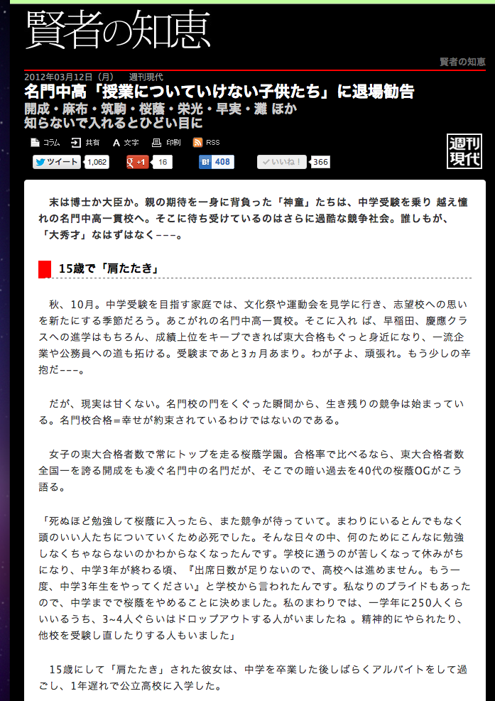 危険なのはGW明け…!『引きこもりの専門家』が明かす「中学受験」と「不登校」の知られざる関係性 フライデー記事掲載昨年、同時期に週刊現代より、名門中高一貫校「授業について行けない子達に退場勧告」開成,麻布,筑駒,桜蔭,栄光,早実,灘など、記事から抜粋しました。