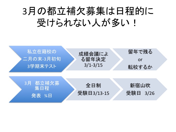 加えて、毎日新聞さんの 高校中退年5万人:転校に制度の壁「柔軟な対応を」 によると、3月、都立全日制補欠募集数2995人。166人が受験し、73人が合格。この少ない受験者数は何を物語るか? 日程的にその上、単位の互換性を乗り越え、この試験を受けらる人は限られ、合格するのも非常に厳しいものだと言うことがデータで読み取れるのでは無いでしょうか?