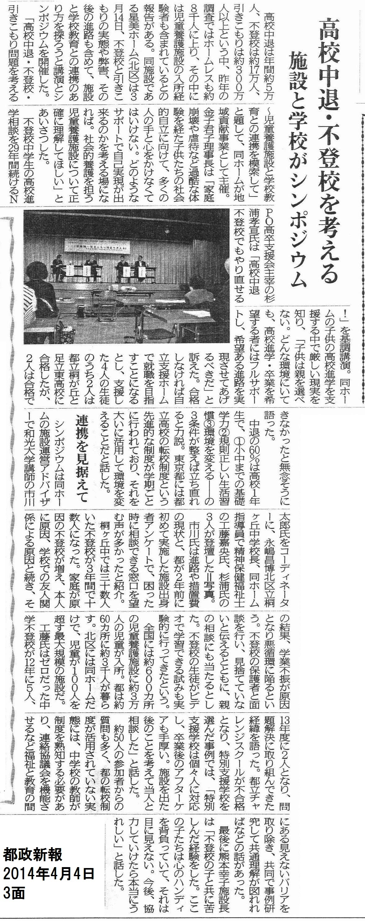 高校中退・不登校を考える 児童養護施設と学校がシンポジウム 都政新報3面2014年4月4日