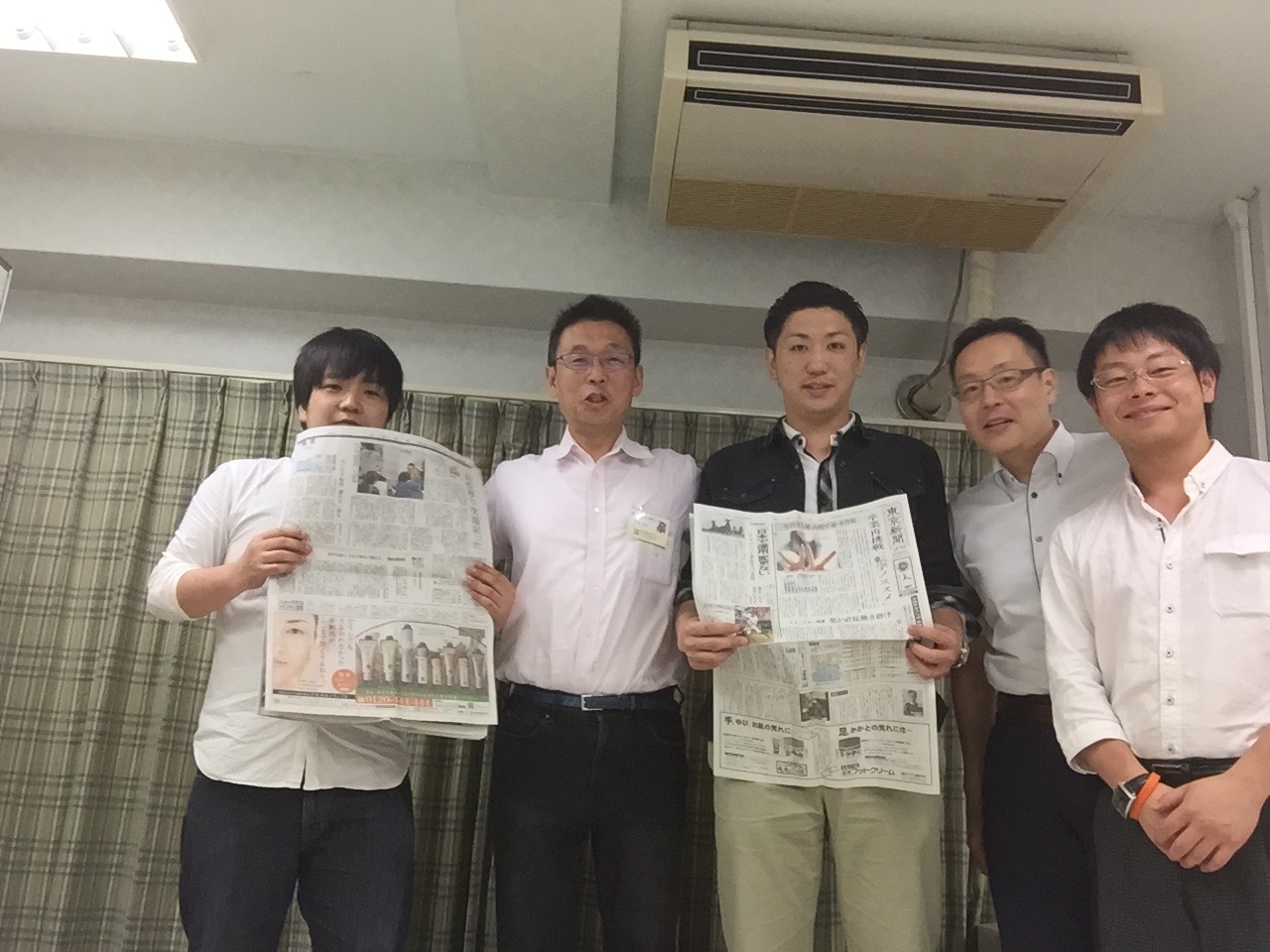 スタッフの持っている新聞は当会の記事がデカデカと載っているものです。