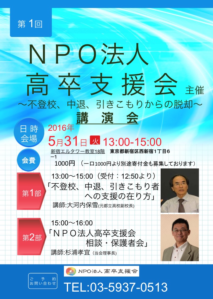 5/31日 不登校・高校中退についての講演会、保護者会を12:50〜 @新宿エルタワー(LEC東京リーガルマインド内)で開催します。未だ、席が若干残っております。参加は info@kousotsu.local または電話03-5937-0513に連絡お待ちしております。