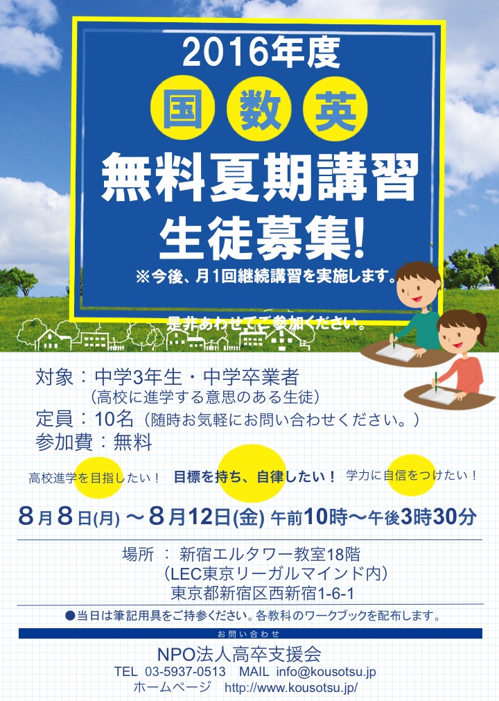 NPO法人高卒支援会 プロジェクトFlap 夏期講習から高校進学まで無料提供=新宿区から助成金を頂き、貧困世帯の高校進学をお手伝いすることになりました。新宿区在住で、高校進学を控えている生徒さん、不登校から高校進学? 中学卒業後、進路が決まらず、困っている方、夏期講習から当会に来て、高校進学を目指しませんか?