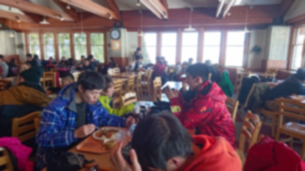 このスキー場は長嶺コースというものがあり、山頂から2〜3kmを麓まで滑りきりコースがあります。レストランまでは1kmほど滑らないとたどり着かないためご飯を食べるのも一苦労です・・・(笑)全員無事にたどり着き、昼食を食べながら小休止しました。午後は、昨日のコースとまた山頂まで行く組に分かれて滑りました。