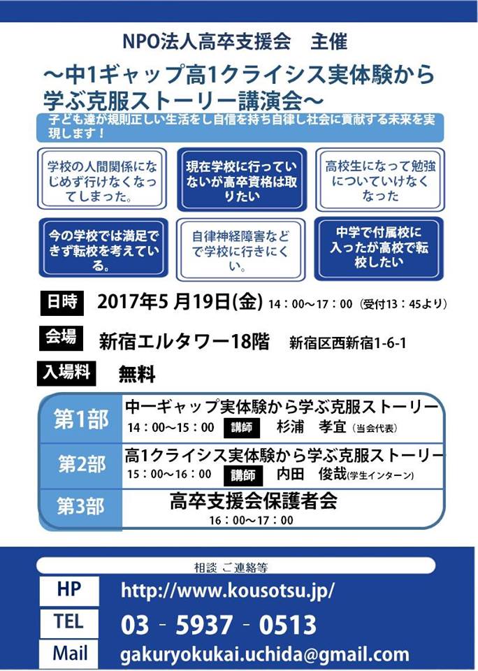 不登校克服伝導師 32年 NPO高卒支援会の杉浦です。
