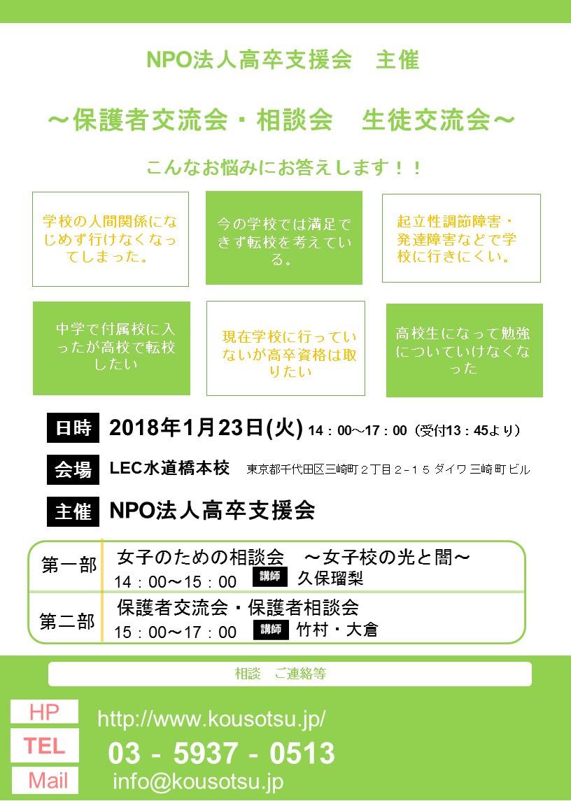 不登校相談・講演・保護者会のお知らせ 本日、1/23日 13:30受付 14:00〜17:00