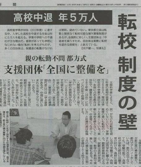 毎日新聞が唯一、高校転校には壁があると、当会の主張を取り上げてくれました
