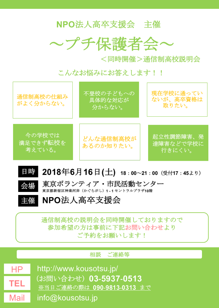 明日、6月16日 18:00〜21:00 プチ保護者・不登校相談会@東京ボランティア・市民活動センター 10階を開催します