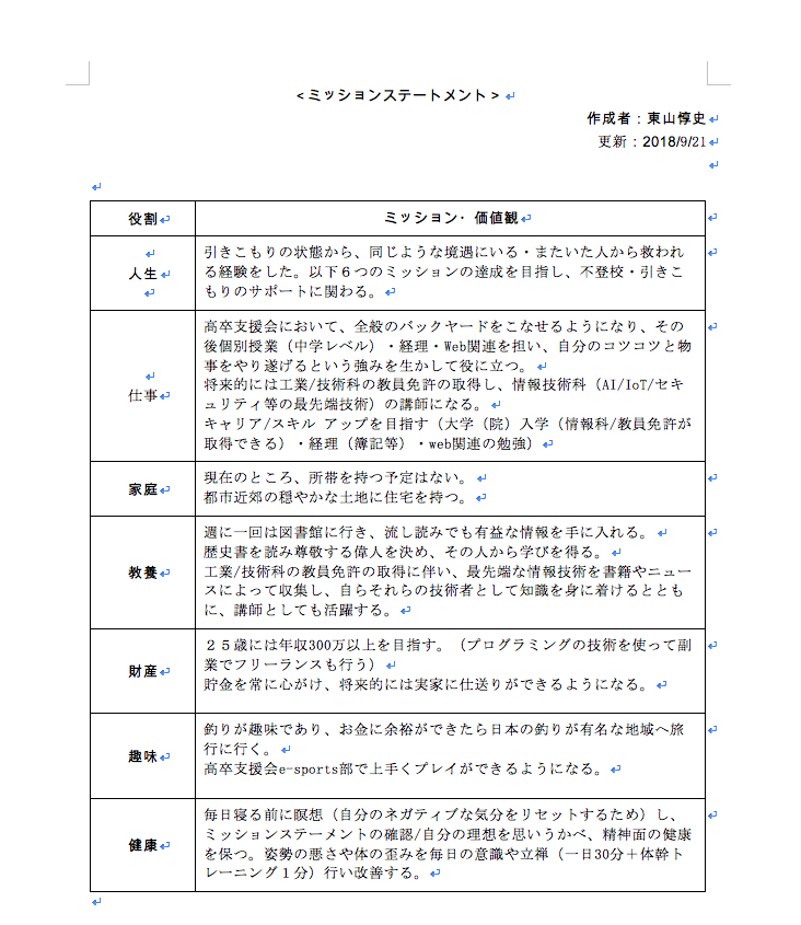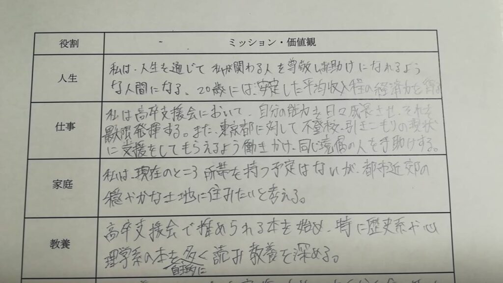 「このミッションステートメントは今のお前にとって、現実的にできそうなことで、将来に向かって、進んでいく指針なんだぞ。現実離れしているんじゃ、また、アレコレ、考えて、動けなくなっちゃうぞ。じゃあ、聞くけど、お前は何で、高卒支援会で働きたいんだ? 今は(その当時)サイゼリヤで働くっていうのも選択肢だろ?」