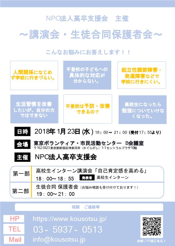 NPO法人高卒支援会の杉浦です. 本日は18:00〜 相談・講演・保護者会です。飯田橋ボランティアセンターで開催します