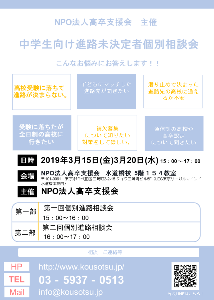 2次募集・通信制高校サポート校・高卒認定・補欠募集の過去問など相談を承ります。