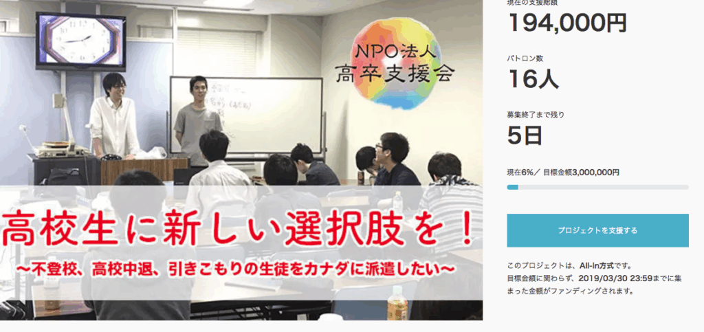 学生インターンをやっている、大学の休みを利用して、クラウドファンディングで不登校の子をカナダ留学させたいという、プロジェクトを立ち上げ、全国のフリースクールをヒッチハイクでまわっています。本日、全国一周から帰ってくる予定です 下記の動画是非、ご視聴下さい