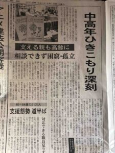 一方、本日の日経の記事に内閣府調査 引きこもりの推定数15歳~39歳 54万1千。 40歳〜64歳 61万3千。8050問題として、大きな問題と報じている。