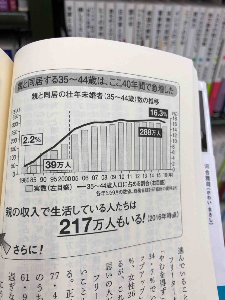 河合雅史さんの未来の年表は大ヒットですね。彼の本で気になること、写メに撮りました。1980年 親に寄生している人39万人 (35歳〜44歳)→ 2016年 217万人。とあります。これに8050問題の50歳代が加え、更に、15歳から34歳の引きこもりを加えたら、どのくらいの数字になるんでしょうか?