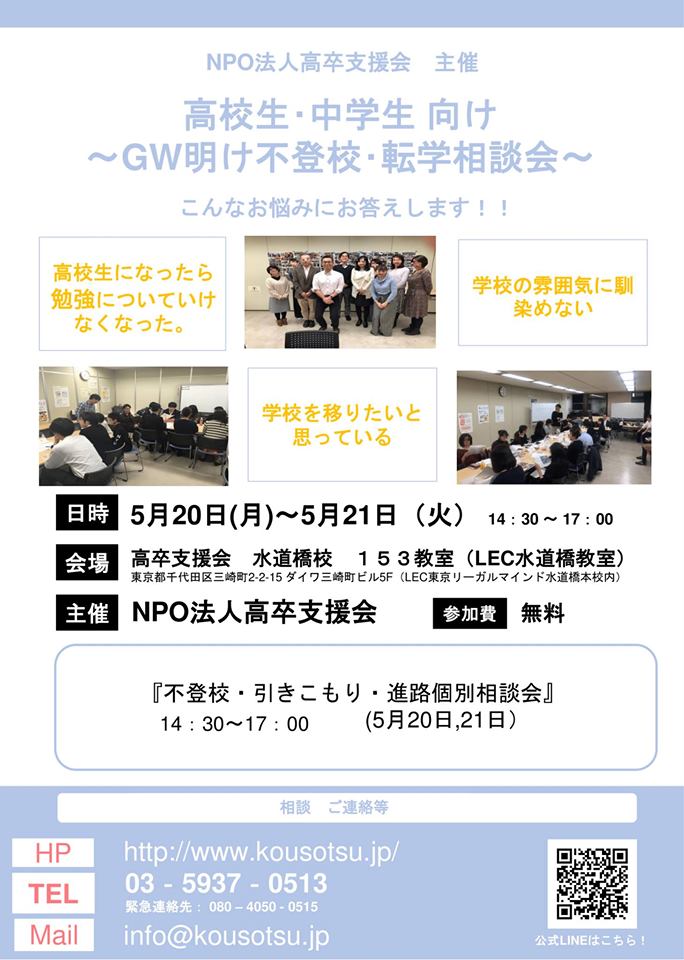 5/20~21日 14:30〜17:00 不登校・講演・相談会@水道橋校