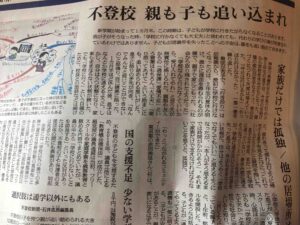 ”不登校の子どもを支援するため、2016年、「教育機会確保法」が成立した”〜と本日、朝日新聞 27面に掲載されている、法律には「学校以外の場での多様で適切な学習活動の重要性」とありますが、今年、当会、学生インターン加藤が全国のフリースクールを周り、実態調査をしてくれましたが、国、自治体からの支援不足で、授業料もまちまちでしたが、保護者にとっては割高になっているところが、多く、フリースクール自体の運営もギリギリと言ったところも少なくないようでした。