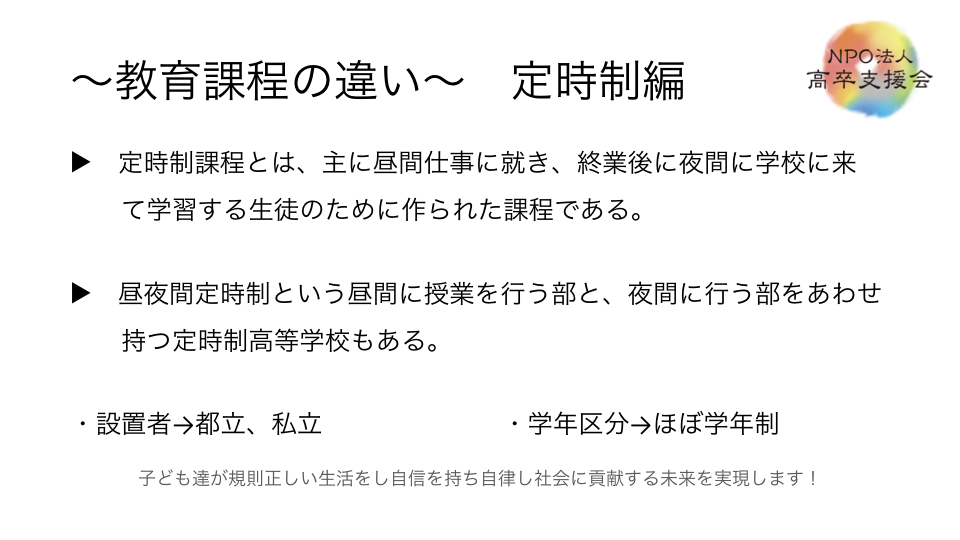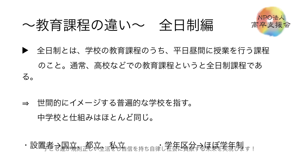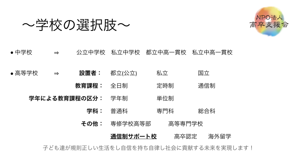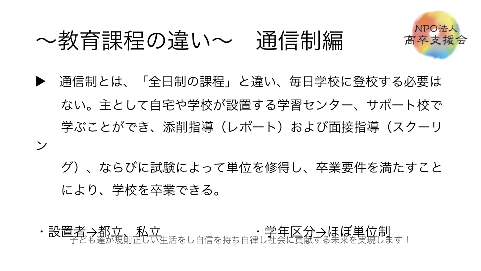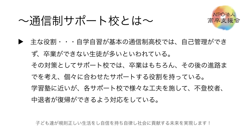 下記は以前、当会が通信制高校サポート校の仕組みと題して、講演したモノです。説明会ご参加の方にはじっくり、通信制高校サポート校は何かをわかるようにご説明させて頂きます、
