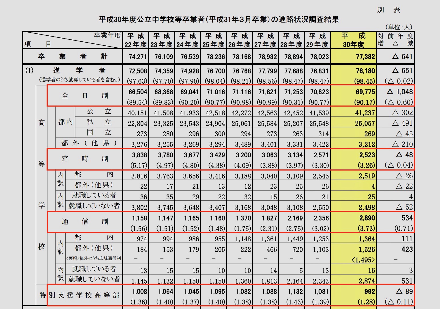 全日制69775人 通信制2890人 定時制2523人 平成29年から定時制と通信制は入れ替わり、逆転しています。
