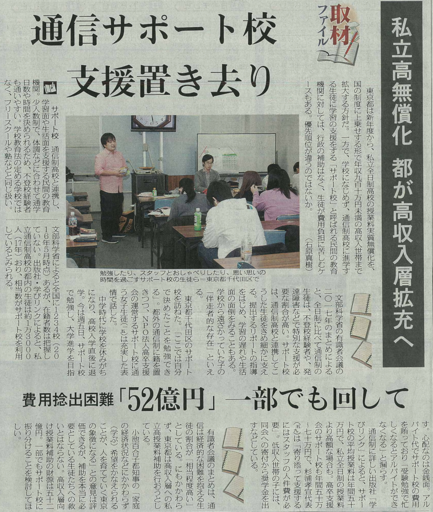 NPO法人高卒支援会の杉浦孝宣です。東京新聞夕刊 2月14日号 7面をお読み頂けたでしょうか? 東京都私立高校の授業料無償化の裏で、通信制サポート校への補助体制が整っていない点について触れられています。