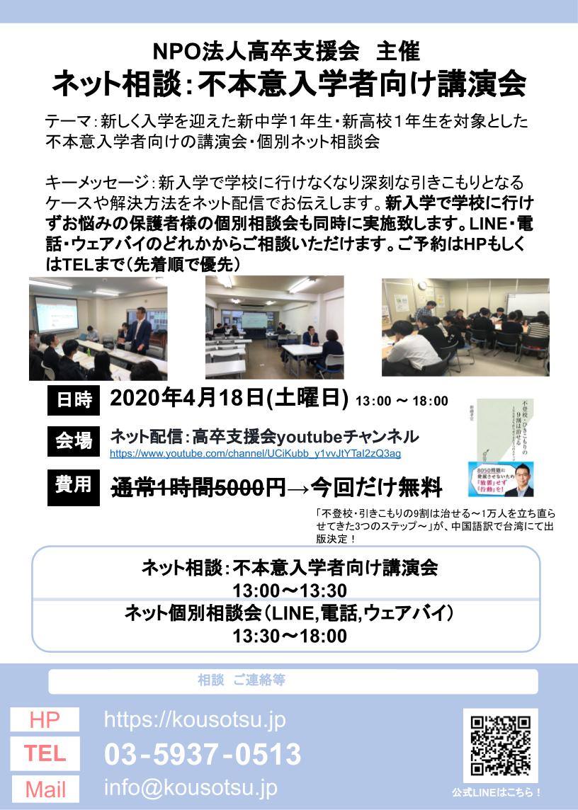 当会は30年以上の不登校塾・フリースクール・通信制高校サポート校 等 出席率80%以上(2019年10月から)@東京都水道橋・新宿エルタワーで 3つのステップ ①規則正しい生活>②自信をつける自律>③社会に貢献できる で不登校・高校中退・引きこもりは克服できます! 引きこもり連れだし率 100%(2019年から2020年2月) ”子ども達が規則正しい生活をし自信を持ち自律し社会に貢献する未来を実現します”の教育ミッションを全国に広め、不登校・高校中退・引きこもり問題の解決を目指します