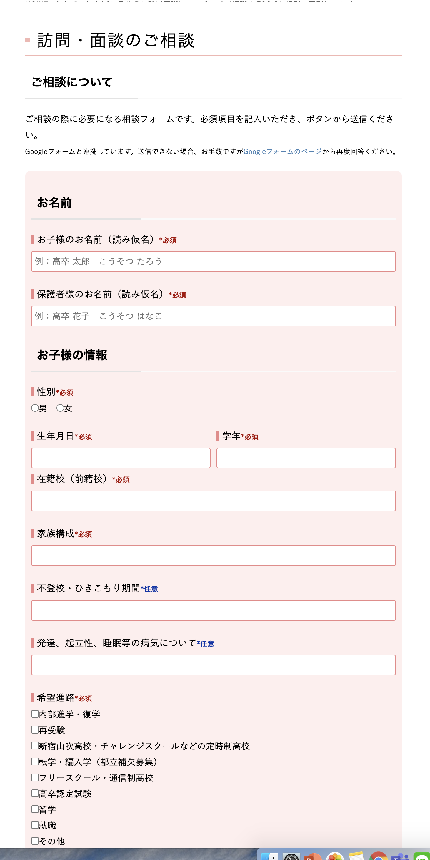 当会はもちろん、医療機関ではありませんが、不登校・高校中退・引きこもり問題の解決を目指していますので、下記の項目を書いて頂けないと、