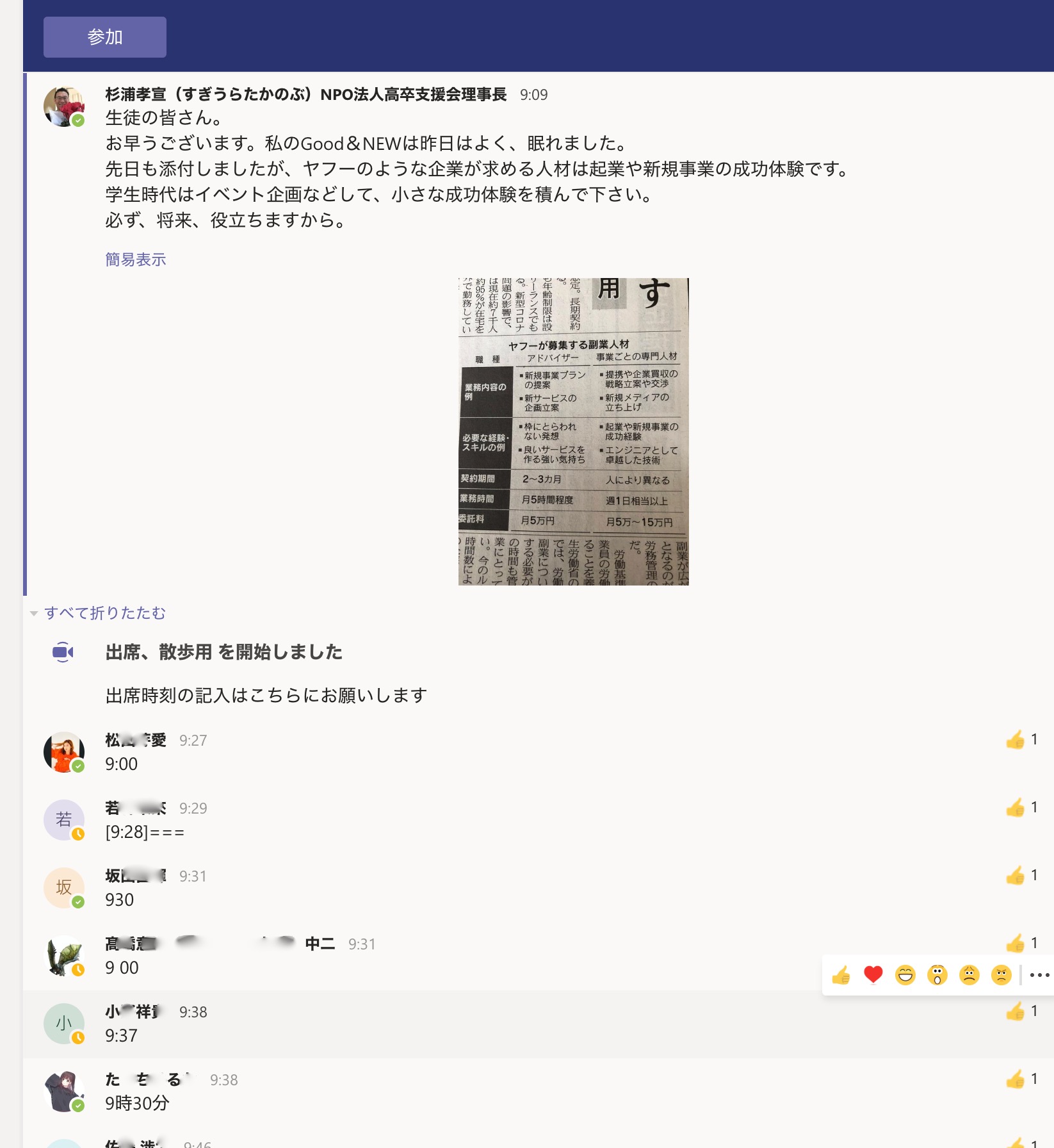 当会はマイクロソフトのteamsで出席を取り、朝礼を行っています。今は学校は閉鎖されていまませんが、いつなるか、わかりませんよね。 緊急事態宣言。