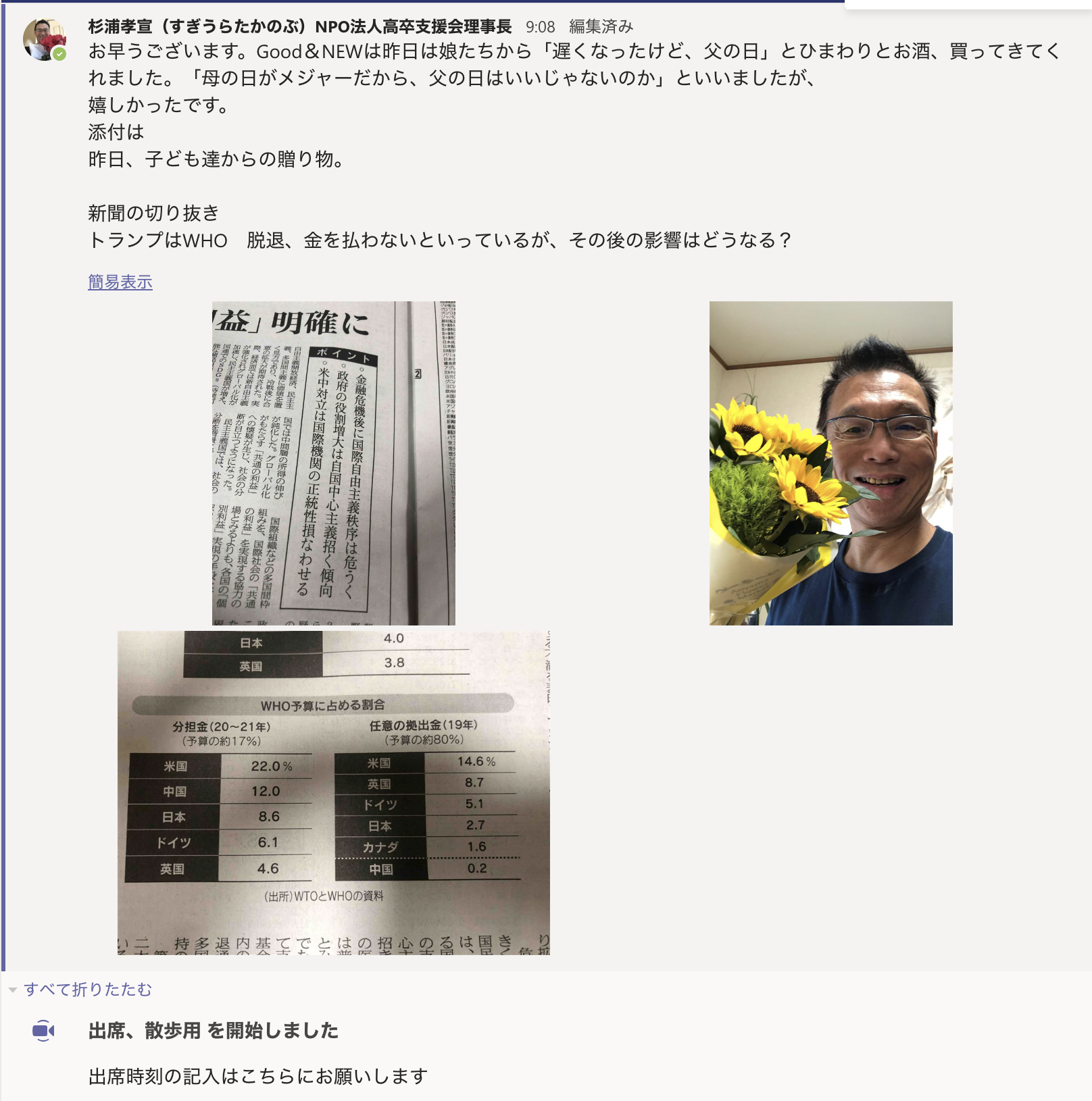 お早うございます。Good&NEWは昨日は娘たちから「遅くなったけど、父の日」とひまわりとお酒、買ってきてくれました。「母の日がメジャーだから、父の日はいいじゃないのか」といいましたが、 嬉しかったです。 添付は 昨日、子ども達からの贈り物。 新聞の切り抜き トランプはWHO 脱退、金を払わないといっているが、その後の影響はどうなる?