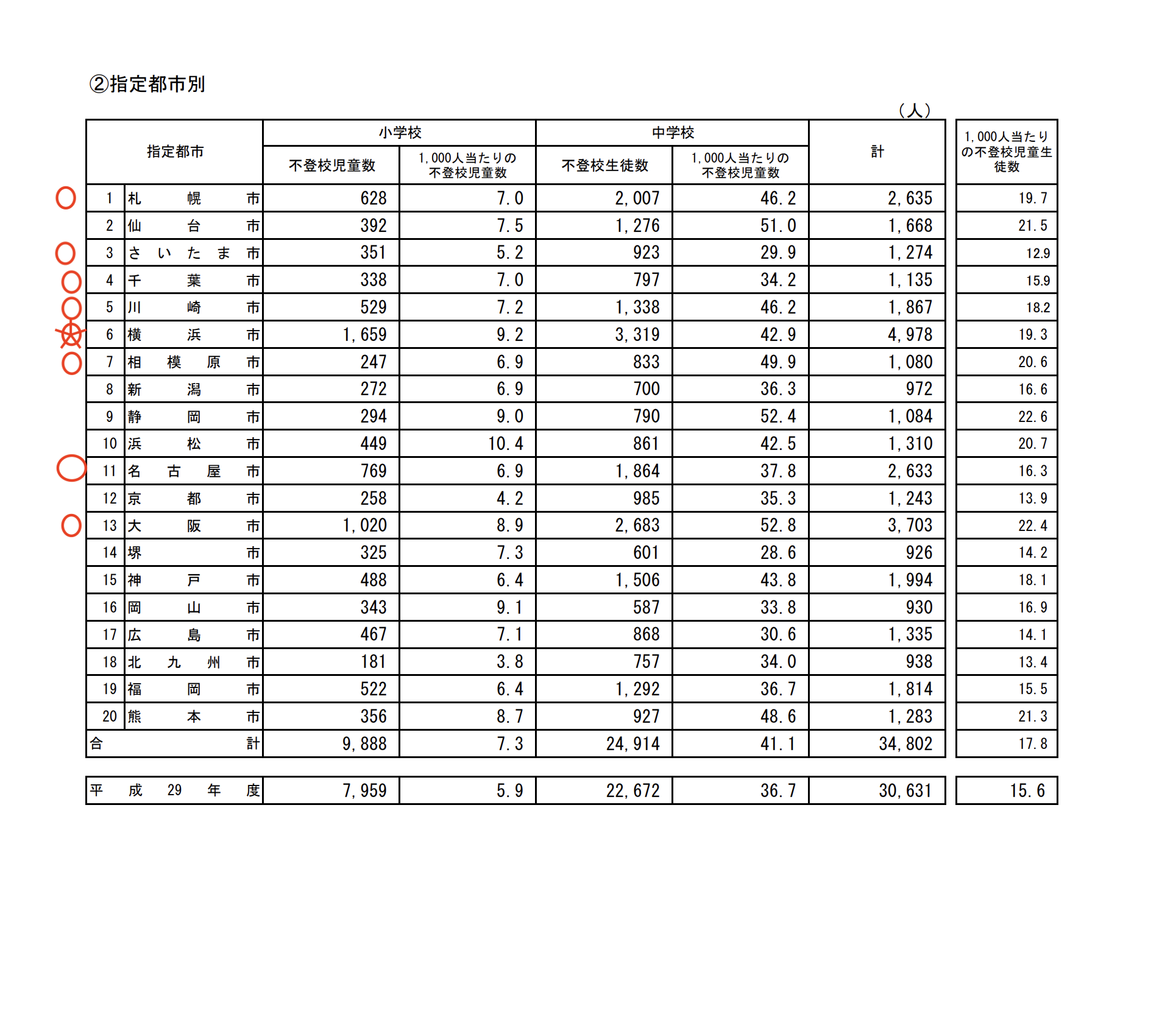 毎年、文科省は児童生徒の問題行動・不登校等生徒指導上の諸課題に関する調査結果について と題して、発表しています。その中に、20の指定都市別(人口 50万人以上)というデータがあります。
