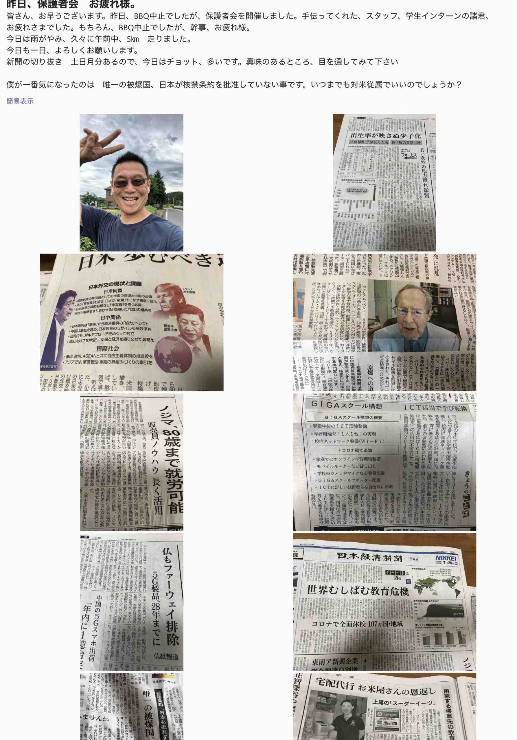 皆さん、お早うございます。昨日、BBQ中止でしたが、保護者会を開催しました。手伝ってくれた、スタッフ、学生インターンの諸君、 お疲れさまでした。もちろん、BBQ中止でしたが、幹事、お疲れ様。 今日は雨がやみ、久々に午前中、5㎞ 走りました。 今日も一日、よろしくお願いします。 新聞の切り抜き 土日月分あるので、今日はチョット、多いです。興味のあるところ、目を通してみて下さい 僕が一番気になったのは 唯一の被爆国、日本が核禁条約を批准していない事です。いつまでも対米従属でいいのでしょうか?