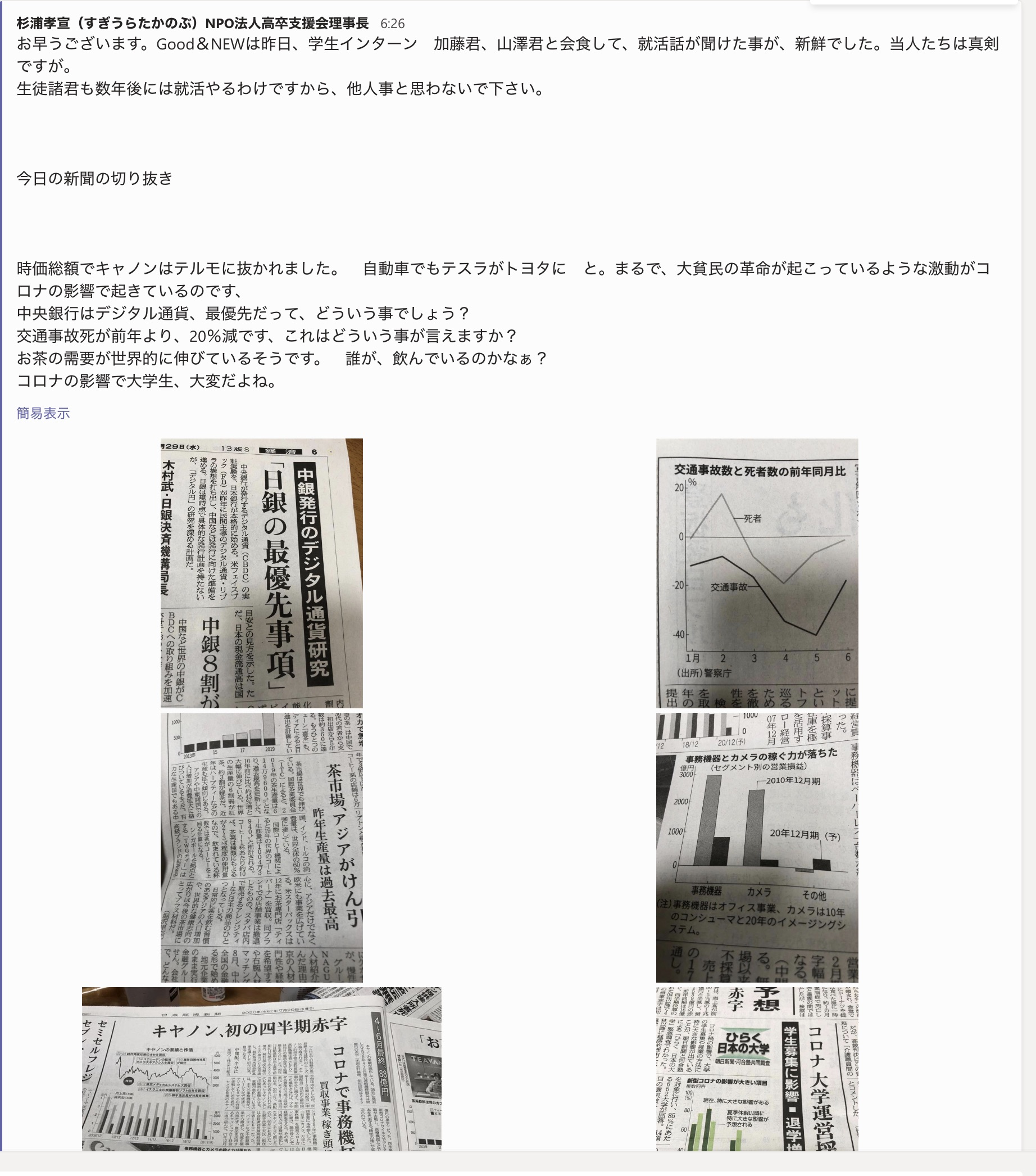 お早うございます。Good&NEWは昨日、学生インターン 加藤君、山澤君と会食して、就活話が聞けた事が、新鮮でした。当人たちは真剣ですが。 生徒諸君も数年後には就活やるわけですから、他人事と思わないで下さい。 今日の新聞の切り抜き 時価総額でキャノンはテルモに抜かれました。 自動車でもテスラがトヨタに と。まるで、大貧民の革命が起こっているような激動がコロナの影響で起きているのです、 中央銀行はデジタル通貨、最優先だって、どういう事でしょう? 交通事故死が前年より、20%減です、これはどういう事が言えますか? お茶の需要が世界的に伸びているそうです。 誰が、飲んでいるのかなぁ? コロナの影響で大学生、大変だよね。