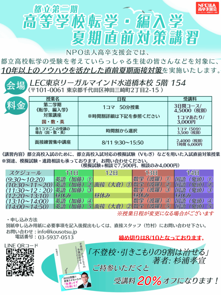 不登校塾・フリースクール・通信制高校サポート校@東京都で運営している、NPO法人高卒支援会の杉浦孝宣です。