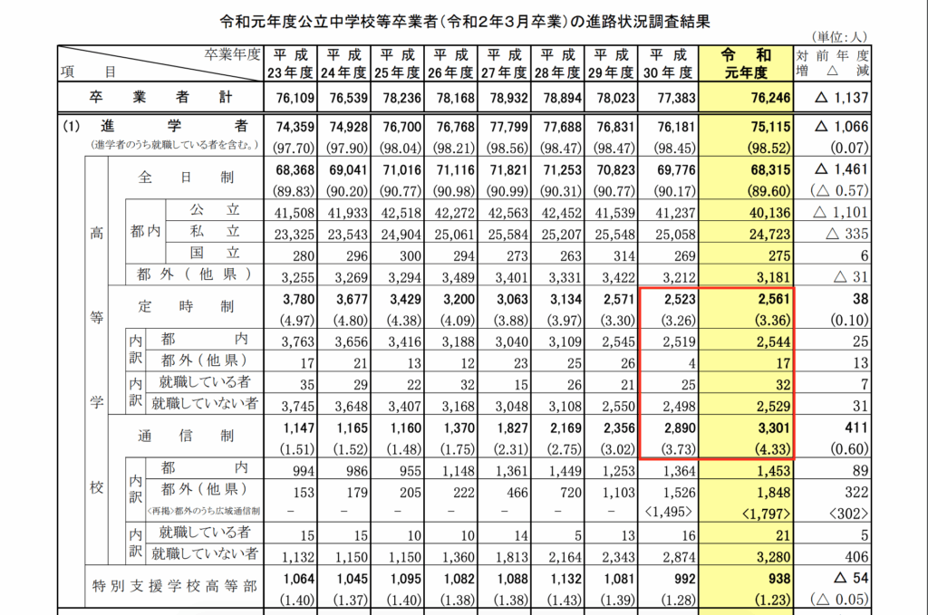 東京都では中学3年の進路先情報が発表されています。2年前から、定時制高校(新宿山吹、チャレンジスクールなども含む)は通信制高校への進学者を下回るようになってきました。