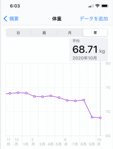 お陰で、入院前の 一年間の平均体重 73.23→68.71 4.52㎏ ダウン。 高校時代のベスト体重になりました。もちろん、運動だけでは無く、栄養、カロリーなどを考慮した、食事も要因の1つでしょう。