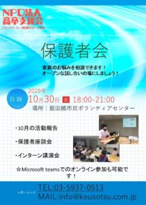 フリースクール・通信制高校サポート校として、毎月、1回 保護者会を開催しているのは東京都では当会だけじゃないでしょうか? 在籍者30名、相談者10名 計 40名前後の小規模だからこそ、できる事でしょうが。 緊急事態宣言の時もオンラインで行いました。 そうした流れから リアル+オンラインで 行っています。
