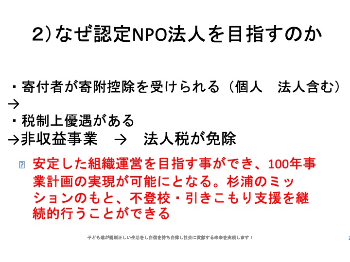 先ずは来年、認定NPOを取得して、経営を安定させる事です。