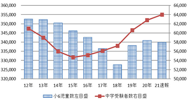 下記は中学受験者数ですが、少子化にもかかわらず、10年間で最高を記録しています。