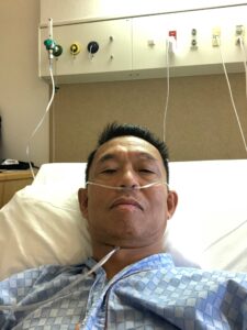 突然、呼吸困難、背中が痛くなり、自力で救急車を呼びました。医療崩壊は起こっていませんでしたから、その日のうちに、入院できました。入院直後は酸素吸入でした。