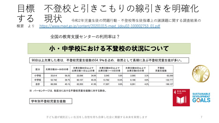 「では、91日目から学校に復帰するのでしょうか? おそらく、しないでしょう。全国には教育支援センターが1500箇所ありますが、どの位の利用率だか、ご存じでしょうか? 12%だそうです。 つまり、88%の子は 学校にも行かず、教育支援センター(不登校児童の公的、居場所)も通わない、引きこもり傾向の子が居て、有効な対策を講じないまま、中学を卒業するというのが現実です。ほとんどの子が引きこもりもしくは引きこもり傾向じゃないかと思います。引きこもりの典型例は次」