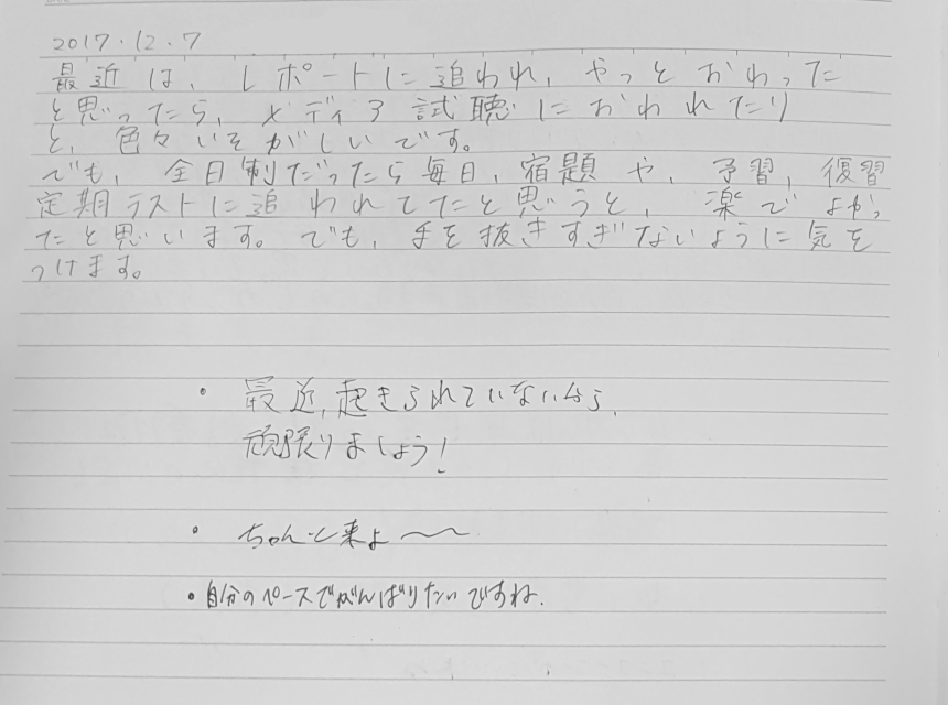 最近はレポートに追われ、やっと終わったと思ったらメディア視聴に追われたりと、色々忙しいです。でも全日制だったら毎日宿題や予習、復習、定期テストに追われていたと思うと楽でよかったと思います。でも、手を抜きすぎないように気をつけます。