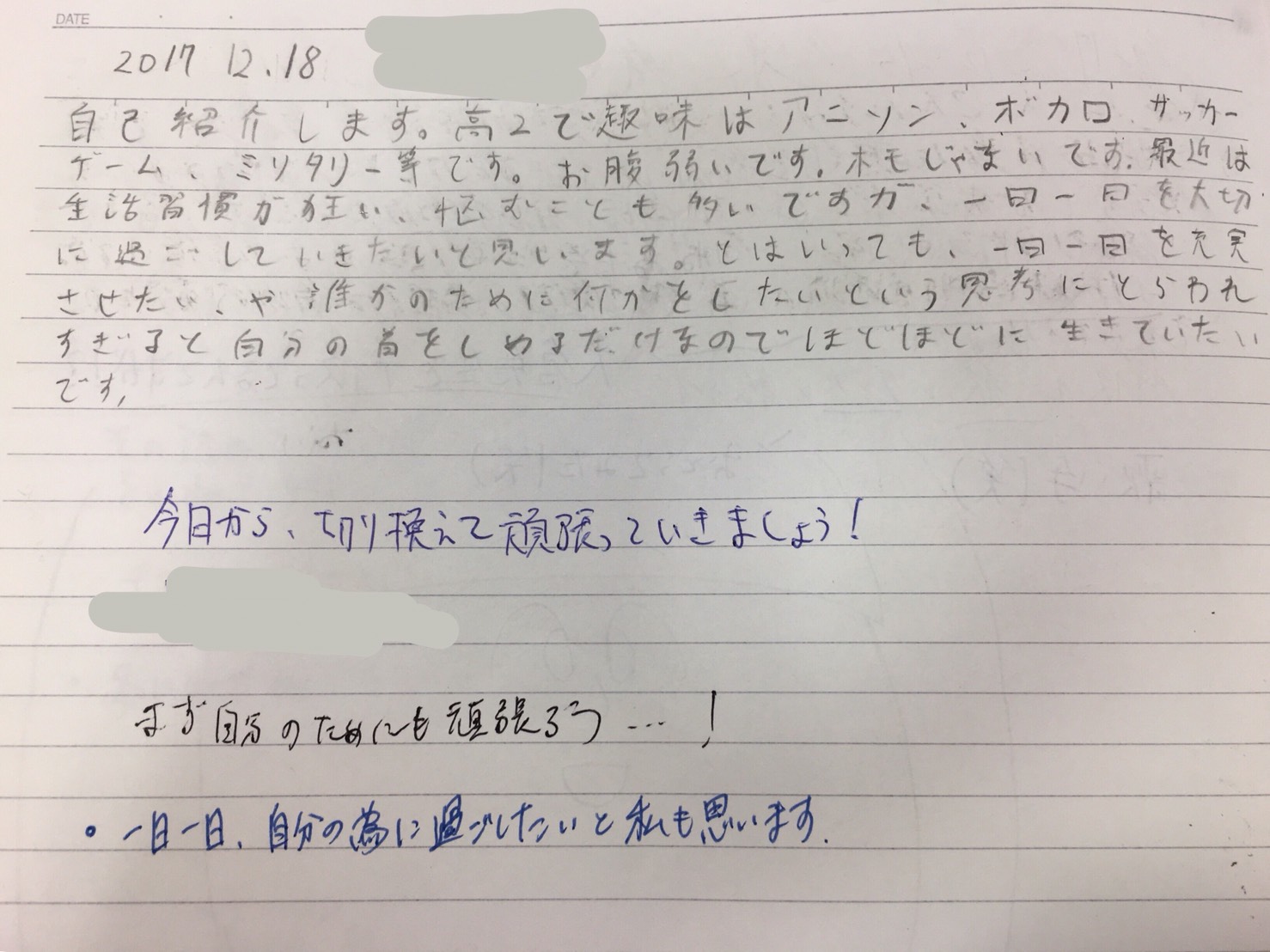 自己紹介します。高2で趣味はアニソン、ボカロ、サッカー、ゲーム、ミリタリーなどです。お腹弱いです。ホモじゃないです。最近は生活習慣が狂い、悩むことも多いですが、一日一日を大切に過ごしていきたいと思います。とは言っても、「一日一日を充実させたい。」や「誰かのために何かをしたい。」という思考に囚われすぎると自分の首をしめるだけなのでほどほどに生きていきたいです。