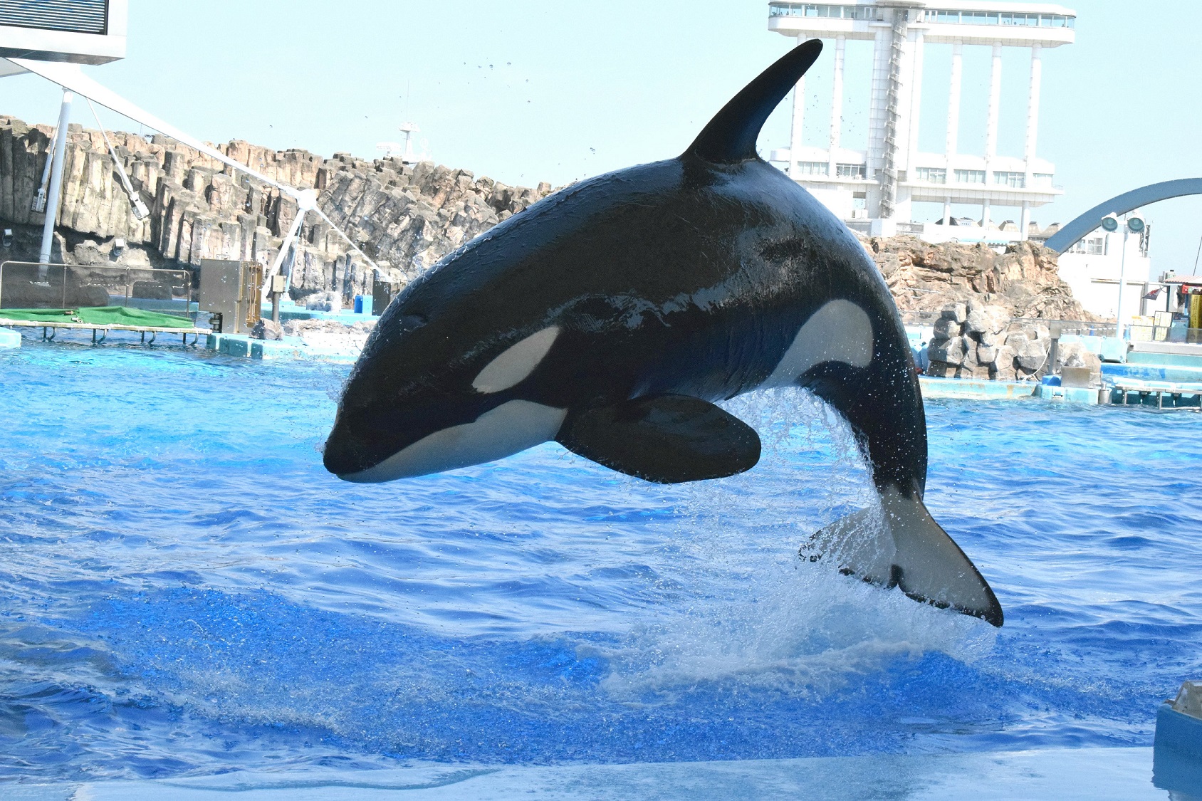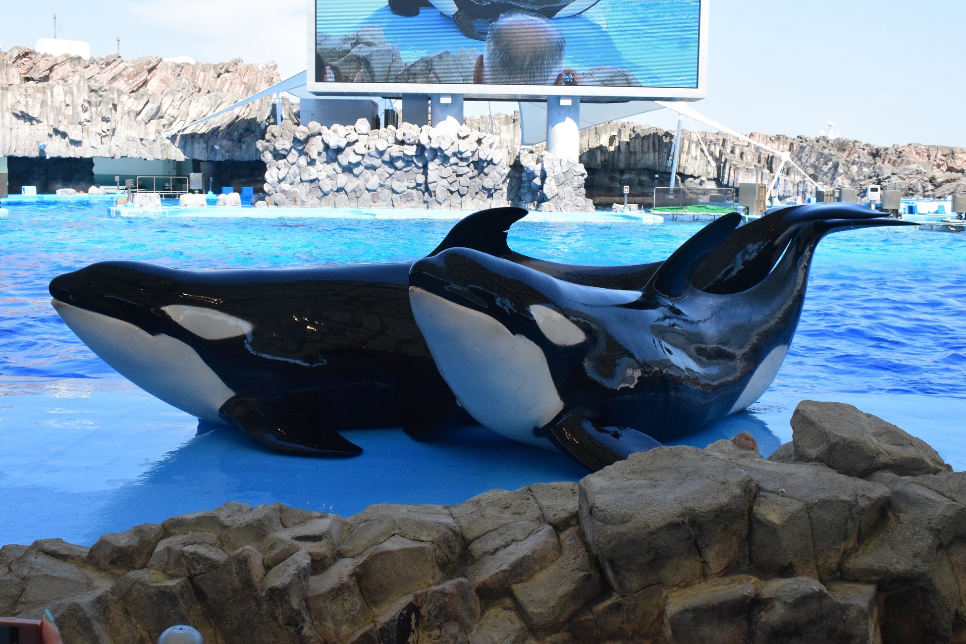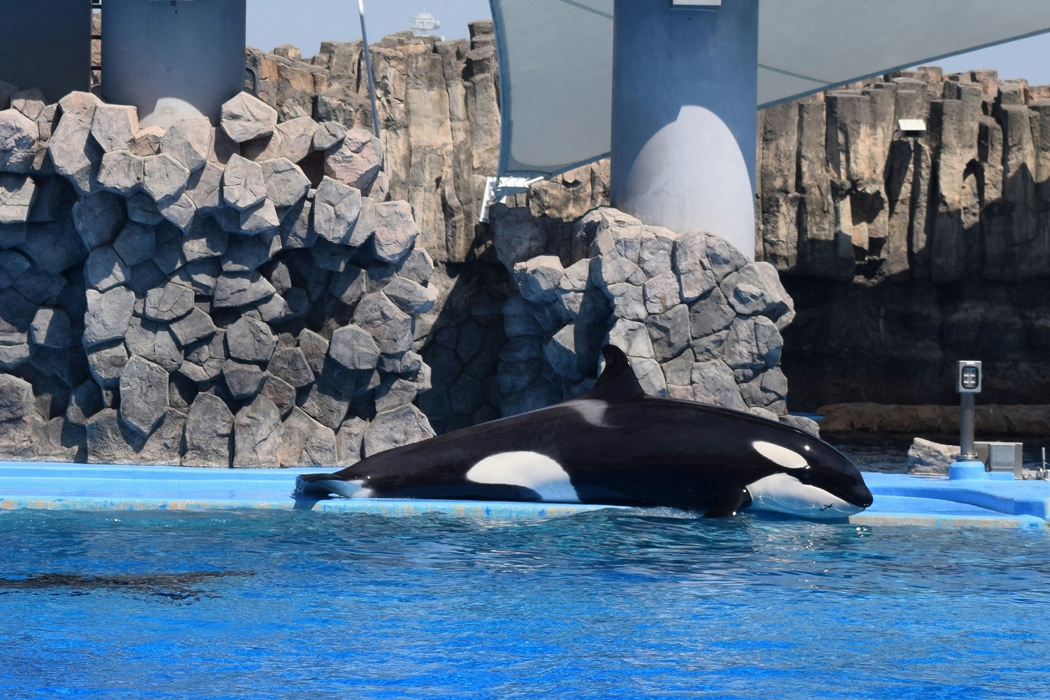 前のイルカショー終了後、特等席をとるために1時間屋外で場所とってました。
