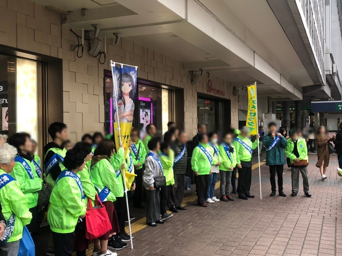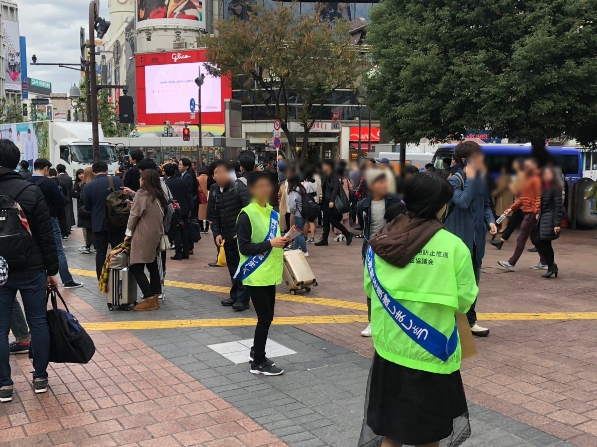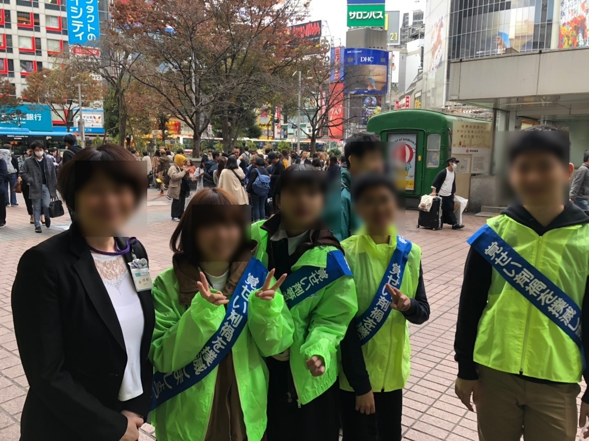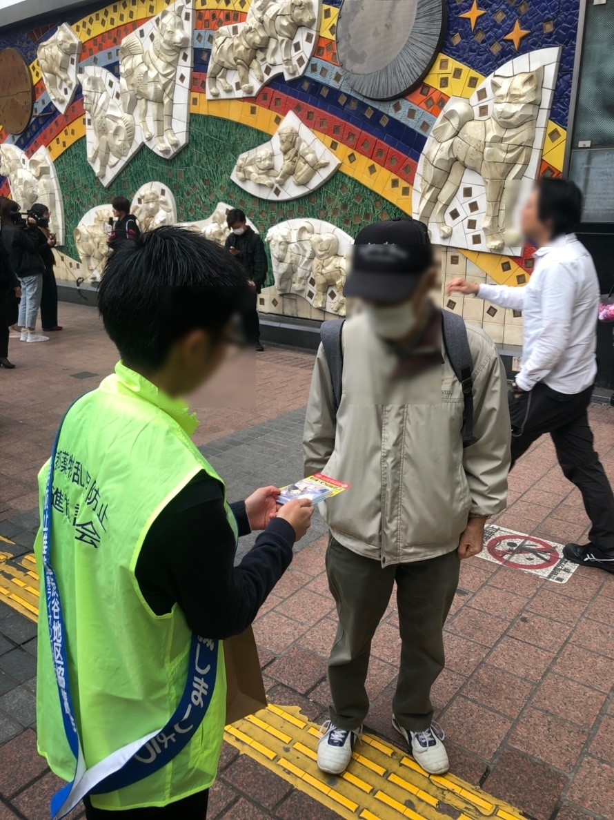 場所は渋谷ハチ公前、東京の中でも更に人通りが多い場所の一つです。ボランティア活動の内容は薬物乱用防止を促すチラシ配りです。