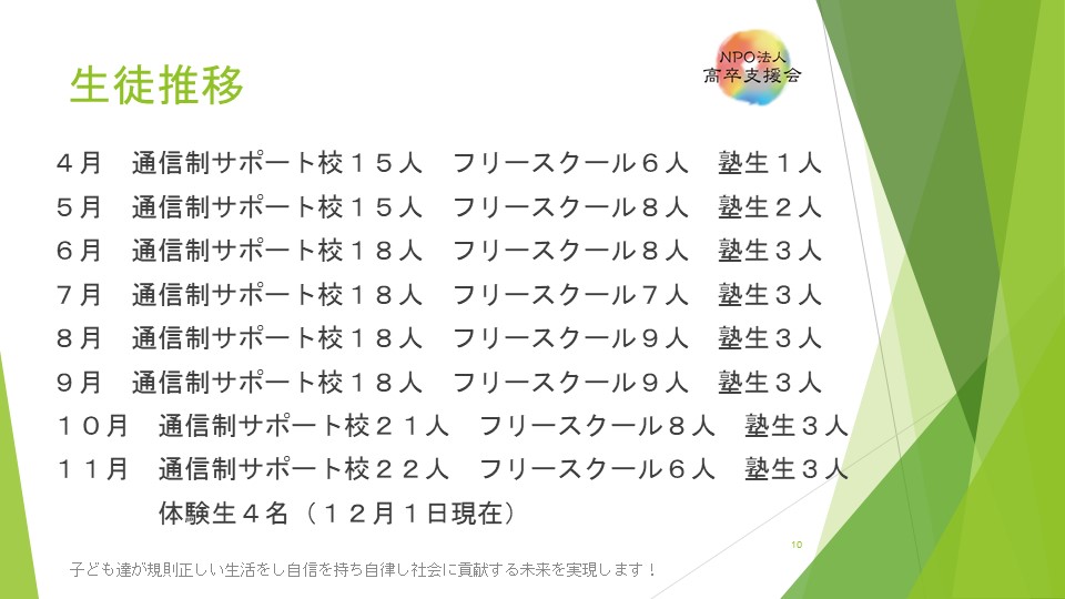 4月と比べ約1.5倍に増えました。また、実際に生徒登校数は格段と上がり現在ではほぼ毎日20人以上登校できるような環境となっております。