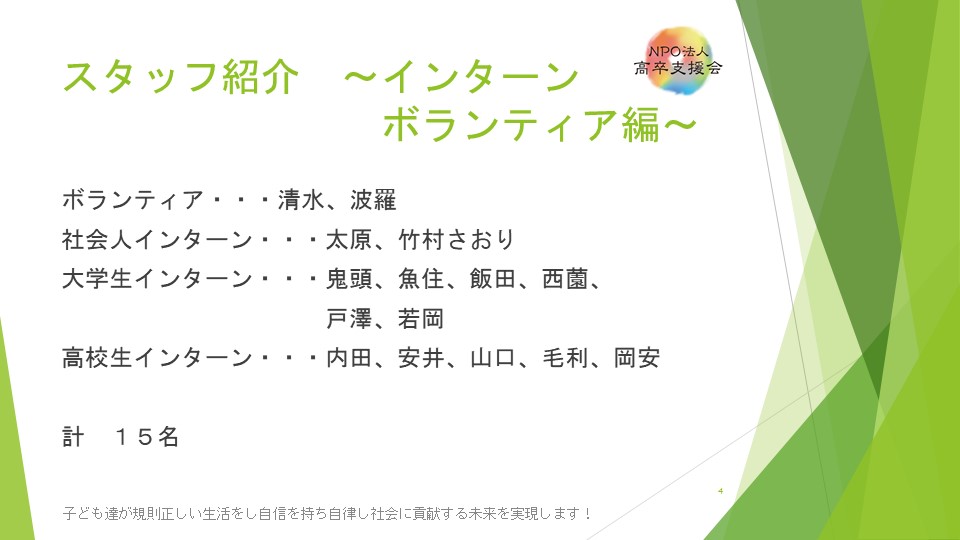 インターンとボランティアの方は、ボラ市民というボランティア掲載サイトにて来てくれた方々が多いです。キャリア教育の一環で当会所属の高校生もインターンシップとして参加しております。