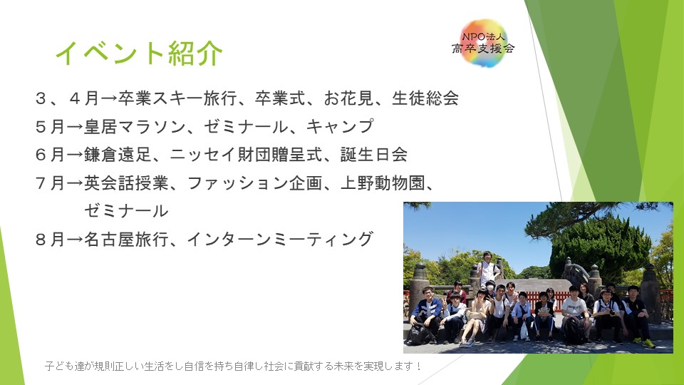 普遍的な学校ではできないような取り組みを中心に、最終的には自律を目指し上級学校に進学や、就職を目指してもらいます。