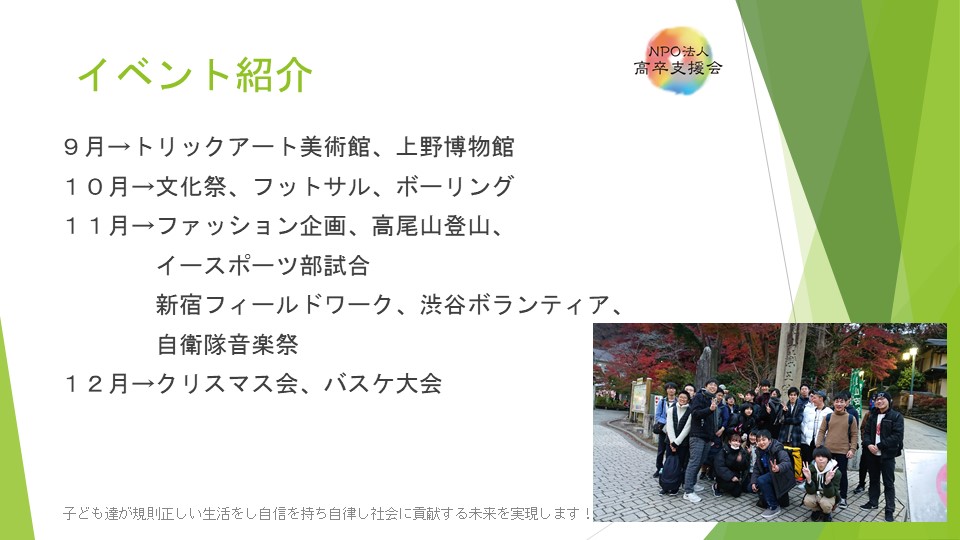 今回の保護者会・忘年会は、NPOとしての活動報告もさせていただきました。