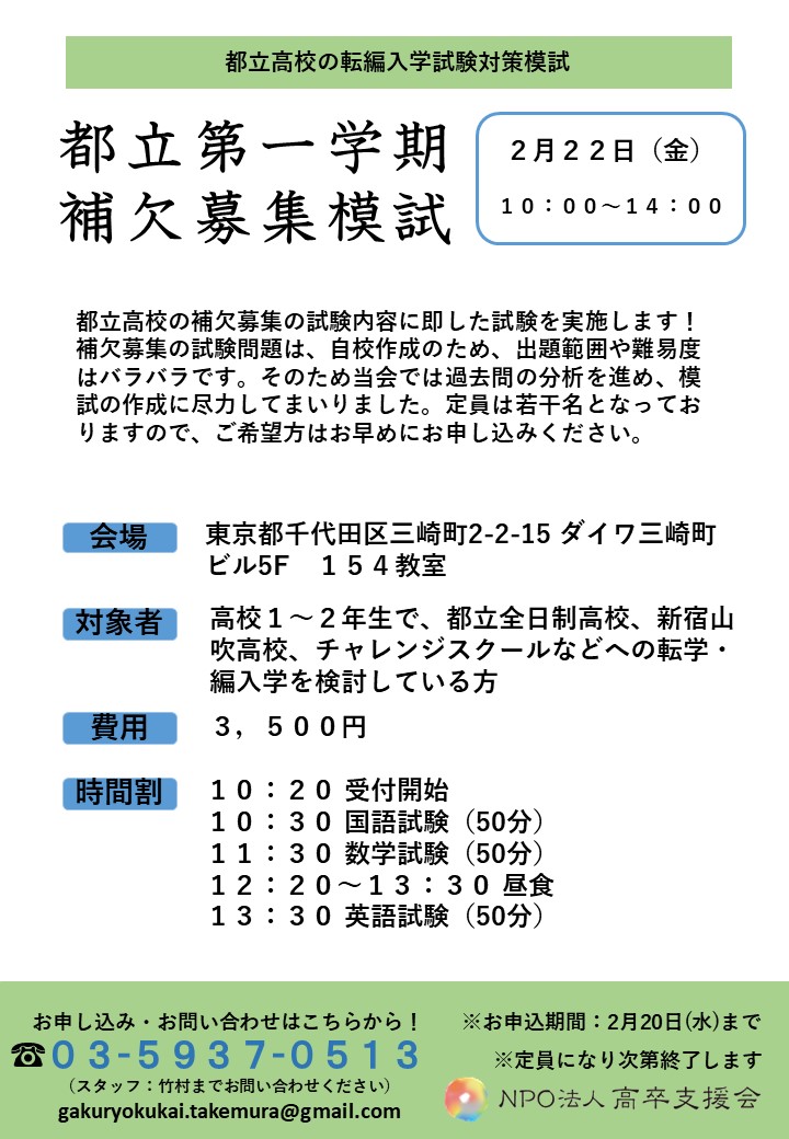 例年、3月1日前後に都立第一学期高等学校補欠募集の要項が発表されます。