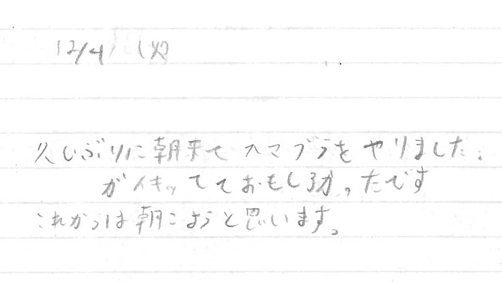 不登校塾・フリースクール 不登校中学・高校生の交換日記 @東京都新宿エルタワー・水道橋 その153 未分類 X Facebook はてブ Pocket LINE コピー 2019.05.30 [冒頭文] 2018年12月4日(火) シン君 久しぶりに朝来てスマブラをやりました。__君がイキってておもしろかったです。 これからは朝来ようと思います。 [文末(水道橋用)]