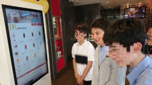 練習を兼ねて、パネルではなく直接オーダーしようといわれ、3人は渋々レジに向かいます。