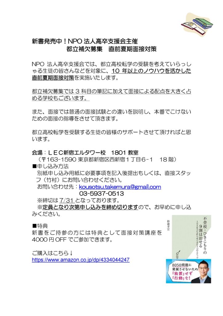 6月末に、現場責任者の竹村が令和元年度第二学期都立高等学校転学・編入学募集